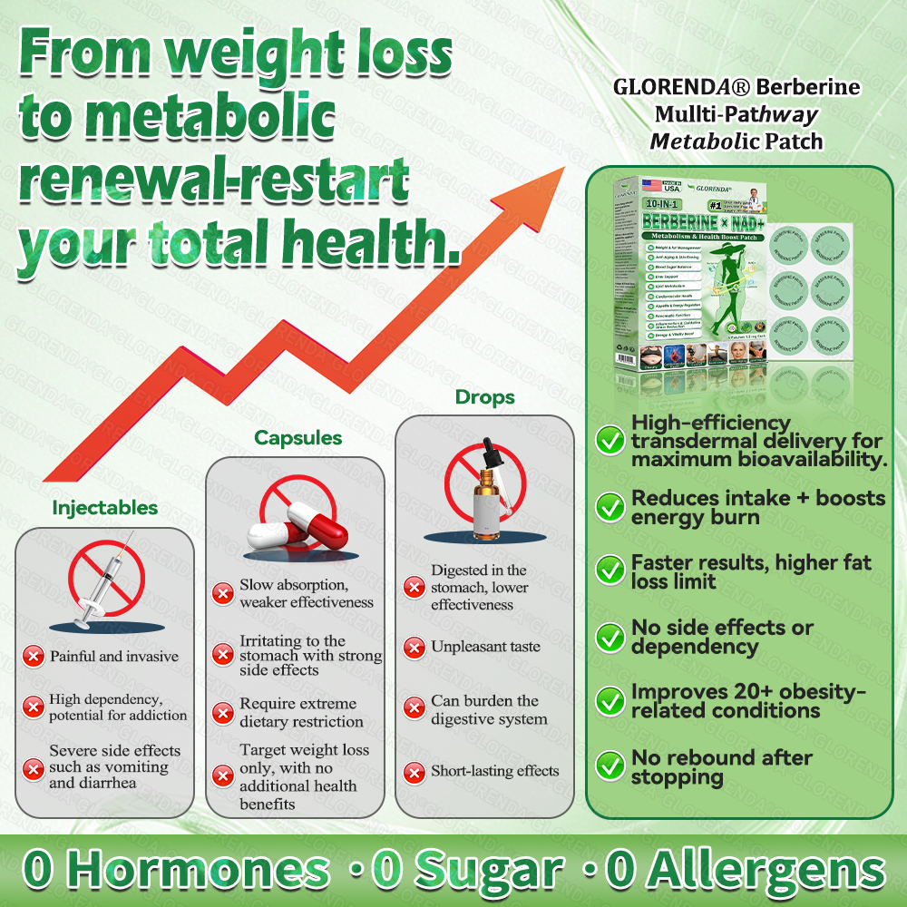 โœ… ๐†๐‹๐—ข๐—ฅ๐—˜๐—ก๐——๐‘จยฎ ๐—•๐—ฒ๐—ฟ๐—ฏ๐—ฒ๐—ฟ๐—ถ๐ง๐ž ๐Œ๐ฎ๐ฅ๐—น๐˜๐—ถ-๐—ฃ๐—ฎ๐˜๐™๐™ฌ๐™–๐™ฎ ๐™ˆ๐’†๐’•๐’‚๐’ƒ๐’๐’๐ข๐œ ๐๐š๐ญ๐—ฐ๐—ต breaking away from the burden of traditional injectable or oral weight-loss products, this advanced nano microneedle transdermal delivery system gently and steadily releases active ingredients for up to 8 hours. Core ingredients Moringa and Berberine work synergistically to support appetite management and lipid metabolism, making fat loss feel more natural and effortlessโ€”without extreme dieting or physical strain. At the same time, NADโบ supports cellular energy levels and skin firmness, helping maintain a healthy, well-toned appearance during body-weight changes. The overall formula is gentle and stable, offering a more comfortable experience for those seeking an effective, non-irritating, and non-injectable approach to weight management.