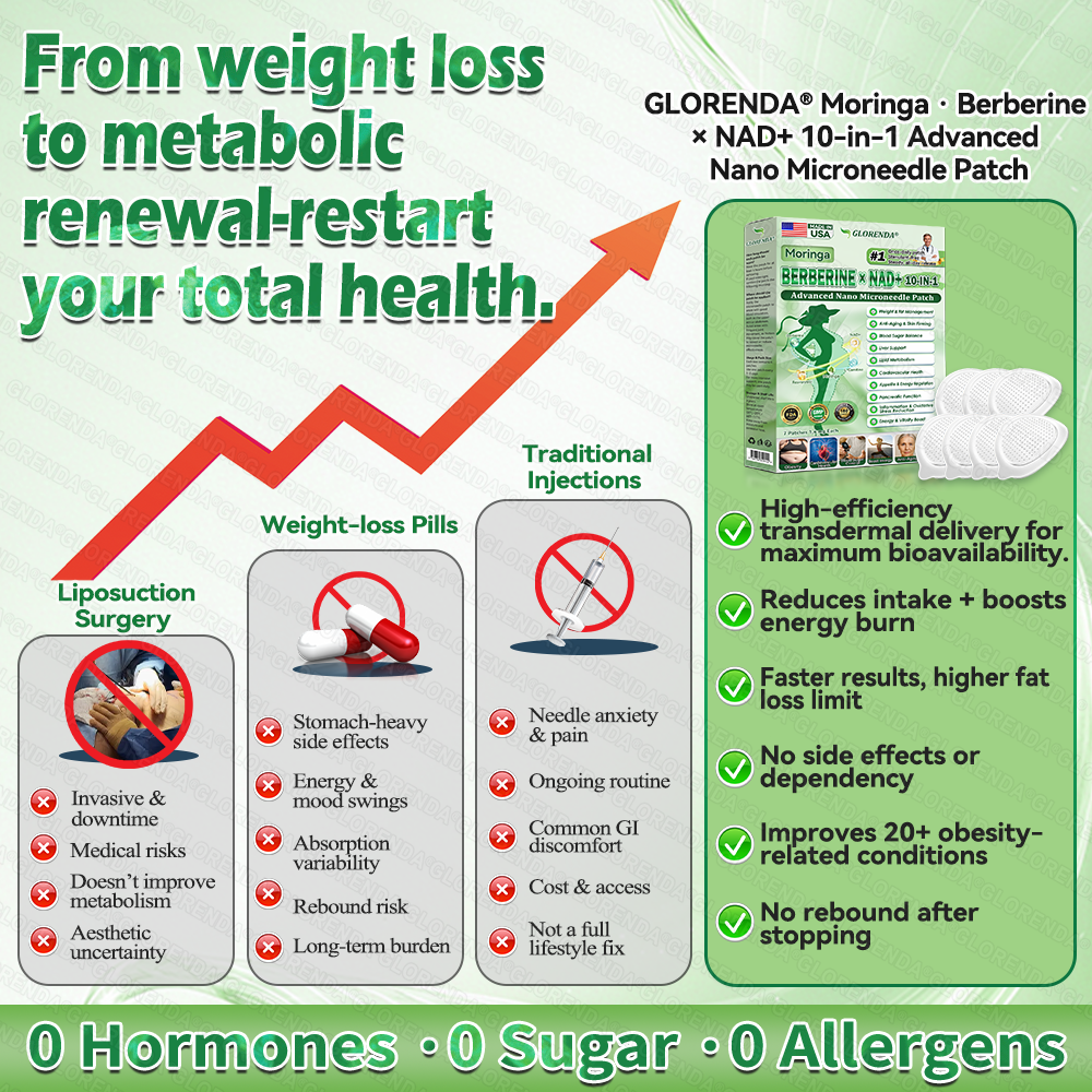 โœ… ๐†๐‹๐Ž๐‘น๐‘ฌ๐‘ต๐‘ซ๐—”ยฎ๐‘ด๐’๐’“๐’Š๐’๐’ˆ๐—ฎ ยท ๐—•๐—ฒ๐—ฟ๐—ฏ๐—ฒ๐—ฟ๐™ž๐™ฃ๐™š ร— ๐™‰๐˜ผ๐ƒ+ ๐Ÿ๐ŸŽ-๐ข๐ง-๐Ÿ ๐—”๐—ฑ๐˜ƒ๐—ฎ๐—ป๐—ฐ๐™š๐™™ ๐™‰๐™–๐™ฃ๐™ค ๐™ˆ๐™ž๐™˜๐™ง๐™ค๐™ฃ๐™š๐™š๐๐ฅ๐ž ๐๐š๐ญ๐™˜๐™ breaking away from the burden of traditional injectable or oral weight-loss products, this advanced nano microneedle transdermal delivery system gently and steadily releases active ingredients for up to 8 hours. Core ingredients Moringa and ๐๐ž๐ซ๐—ฏ๐—ฒ๐ซ๐ข๐ง๐ž work synergistically to support appetite management and lipid metabolism, making fat loss feel more natural and effortlessโ€”without extreme dieting or physical strain. At the same time, NADโบ supports cellular energy levels and skin firmness, helping maintain a healthy, well-toned appearance during body-weight changes. The overall formula is gentle and stable, offering a more comfortable experience for those seeking an effective, non-irritating, and non-injectable approach to weight management.